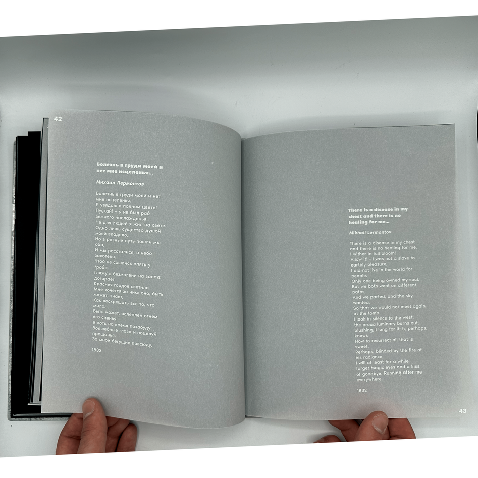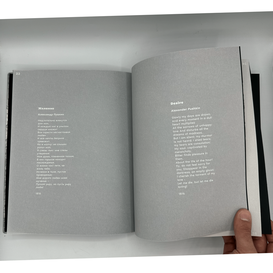 The book features white ink on translucent vellum, symbolizing emptiness and fleeting light, with black pages inserted between to represent the darkness associated with toska. The metal covers, crafted through water-jet cutouts, add a physical weight to the concept, further emphasizing the gravity of the word.